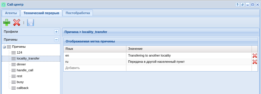 | Технический перерыв если оператор отклонил вызов (auxwork_if_reject) | строка | Если установлена какая-либо причина технического перерыва, и оператор отклонил вызов, этот оператор будет принудительно переведен в состояние "Технический перерыв". |