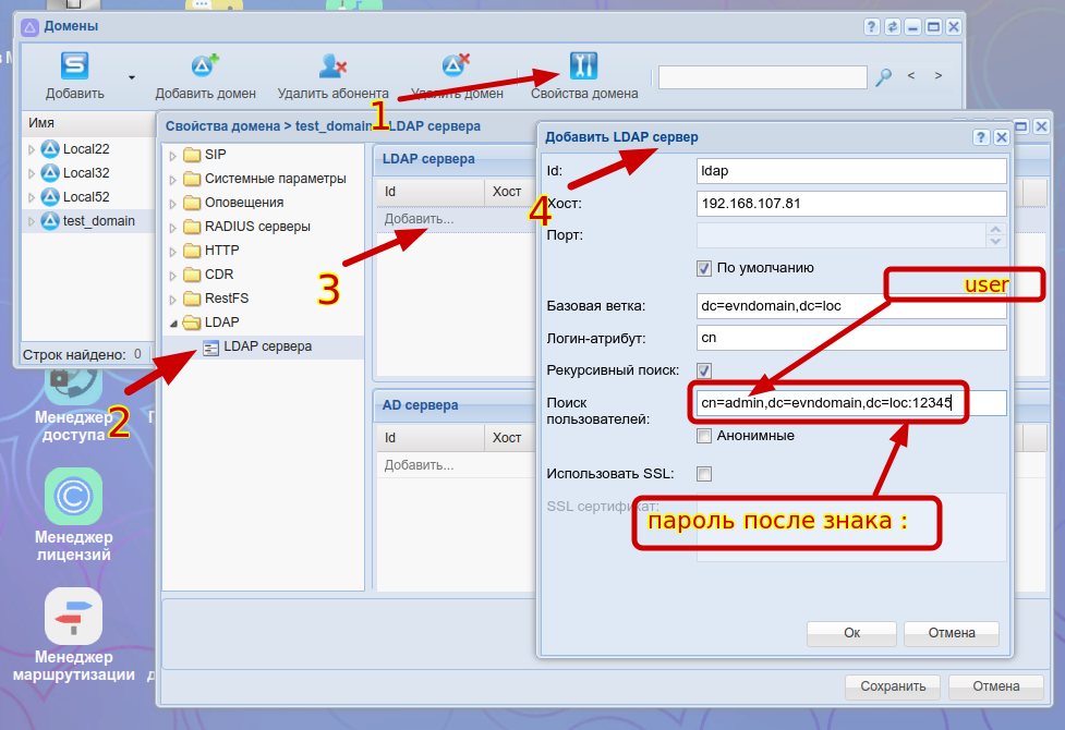 Обратите внимание на поле «Поиск пользователей». В нем указывается логин и пароль в формате «cn=<name>,dc=<name>,dc=<name>:12345». Перед паролем водится «:»