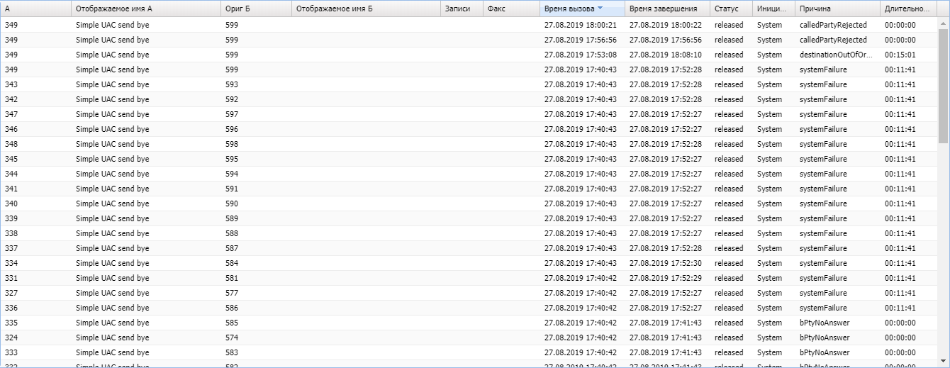 | Инициатор (Initiator) | Инициатор завершения вызова: – А — отбой вызова по инициативе абонента A; – B — отбой вызова по инициативе абонента Б; – System — вызов завершен системой |