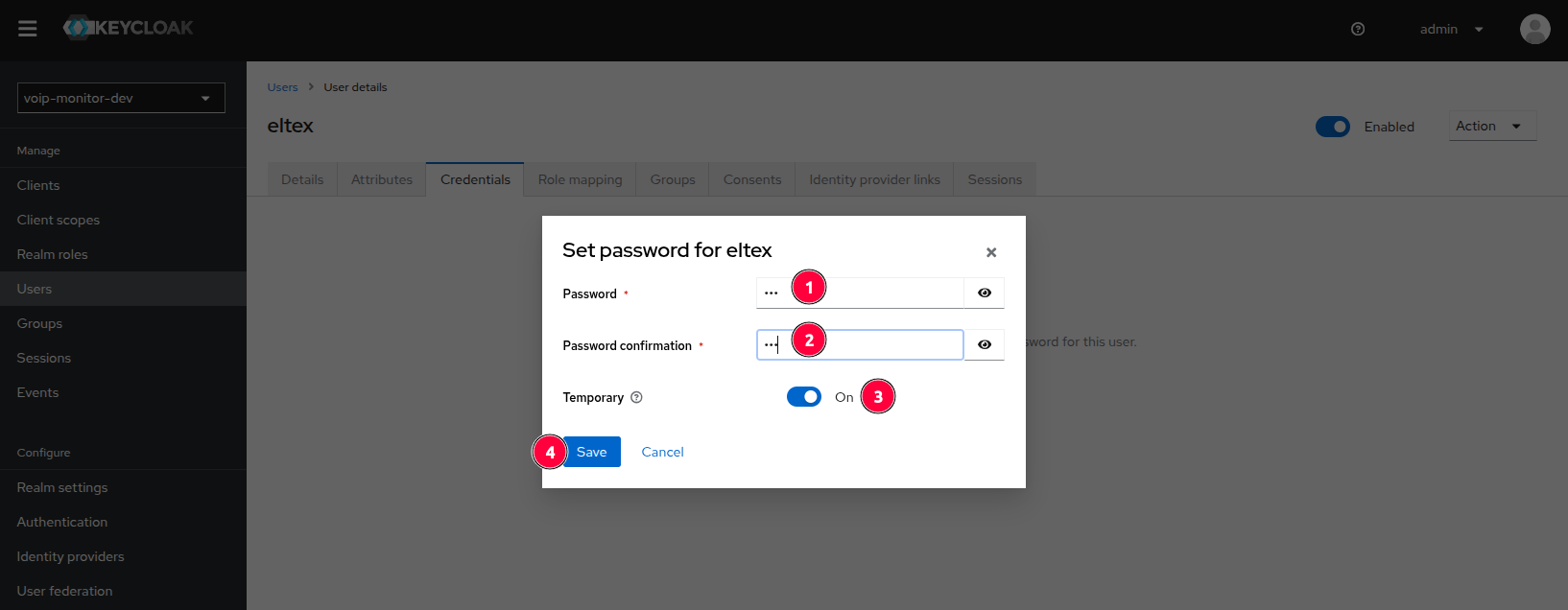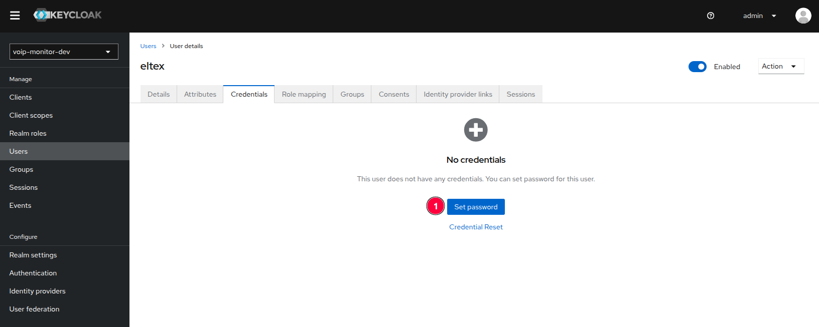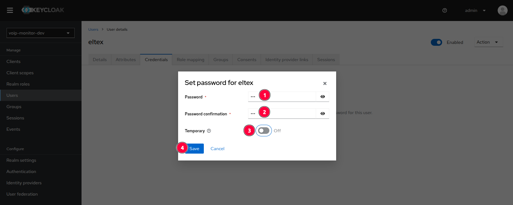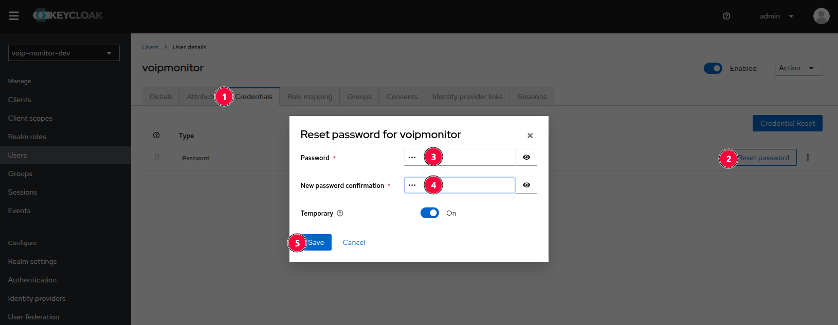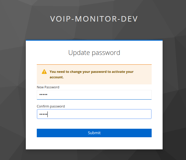 В закладке "Credentials" выберите "Reset password" и установите для пользователя voipmonitor вместо пароля по умолчанию "voipmonitor" новый пароль для первоначального входа в систему VoIP Monitor. При первом входе пользователь укажет постоянный уникальный пароль:
