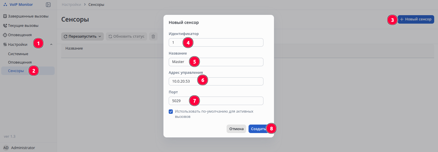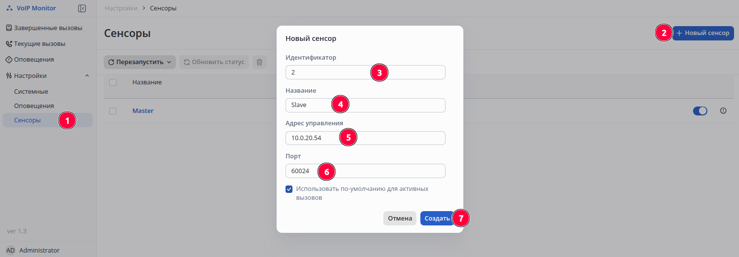 После установки выполните конфигурацию для взаимодействия между серверами "Master" и "Slave". Данная конфигурация выполняется на вкладке "Сенсоры". По умолчанию конфигурация отсутствует, её необходимо создать.