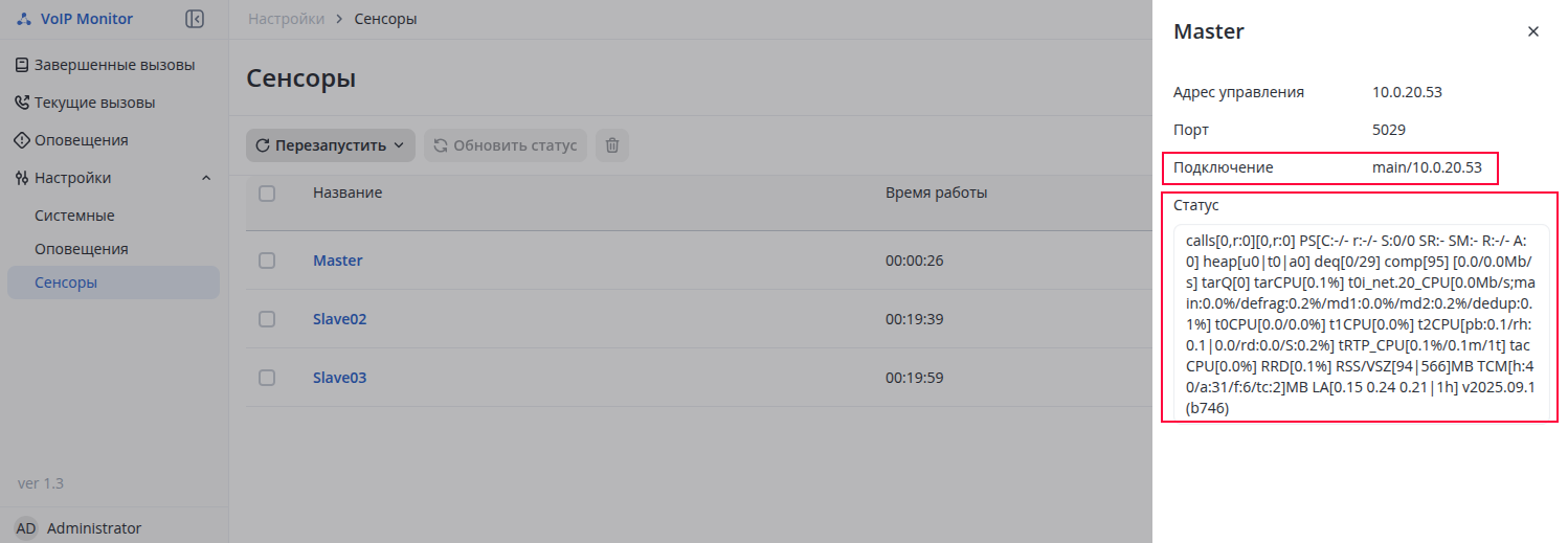Если при поверки статуса сенсора "Slave" отображается "unknown", проверьте конфигурацию файлов /etc/voipmonitor-core/docker/volumes/voipmonitor-configs/conf.d/custom_options.conf на серверах "Master" и "Slave". Исправьте ошибки и выполните перезапуск docker-командой docker restart voipmonitor-core-sniffer на обоих хостах.