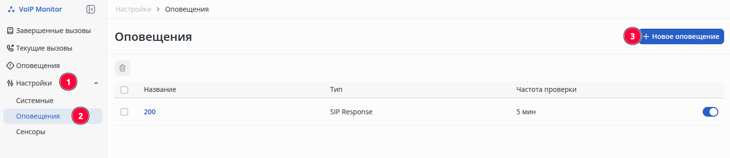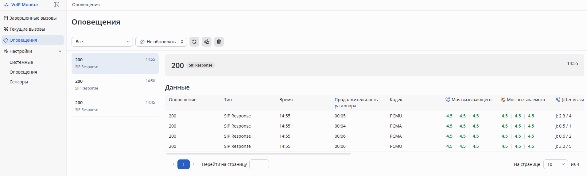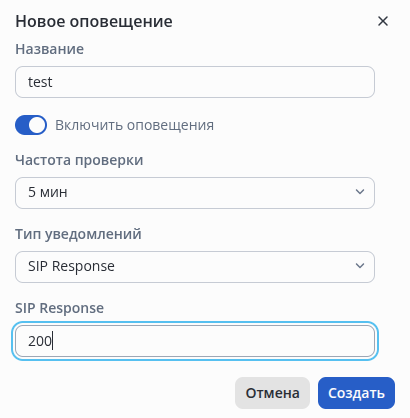 Оператор может конфигурировать критерии оповещения по SIP-ответам или RTP (MOS/PL/Jitter), а также указывать частоту проверки (минимально 5 минут).