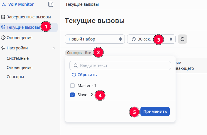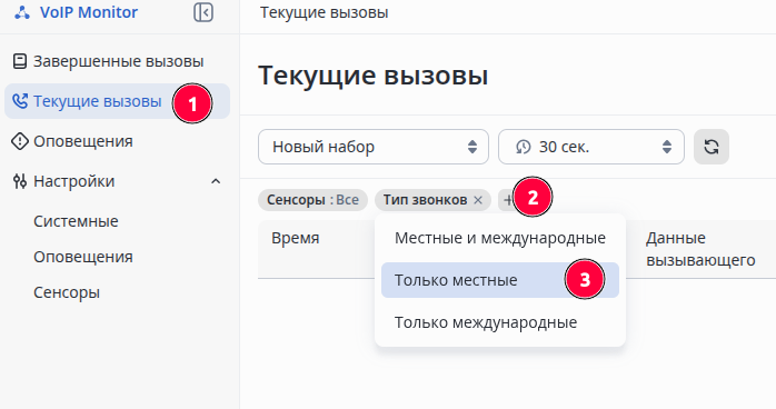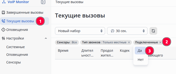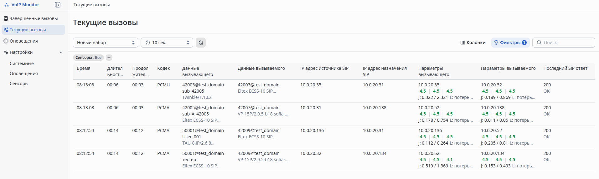 На вкладке "Текущие вызовы" оператор получает возможность просматривать информацию о звонках, выполняемых в настоящий момент, но без возможности сохранять данные в PCAP- или CSV-файл, так как звонок еще не завершен.