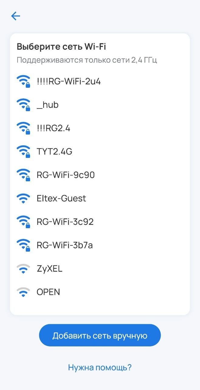 8. (Только для беспроводного способа подключения) Укажите вашу домашнюю сеть (2.4 ГГц), которая используется для подключения к Интернету. Введите пароль от нее и нажмите Далее. Примите запрос на переподключение.