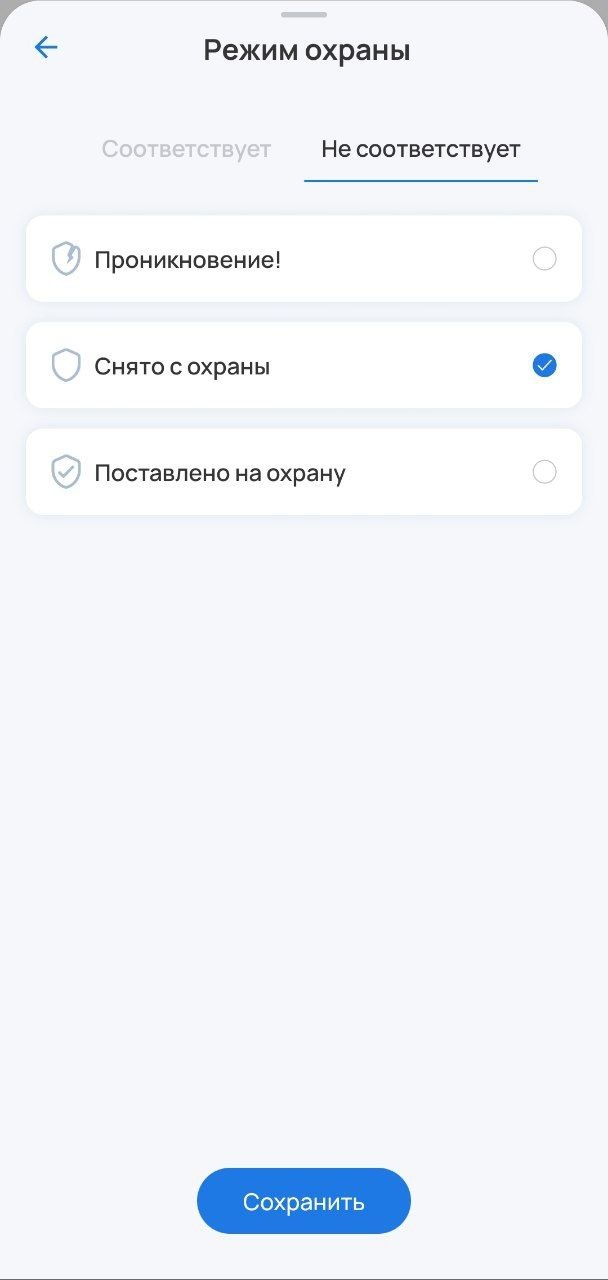 Например, если выбрать условие «Режим охраны не соответствует «Проникновение!», тогда сценарий будет запускаться только при режимах Снято с охраны или Поставлено на охрану.