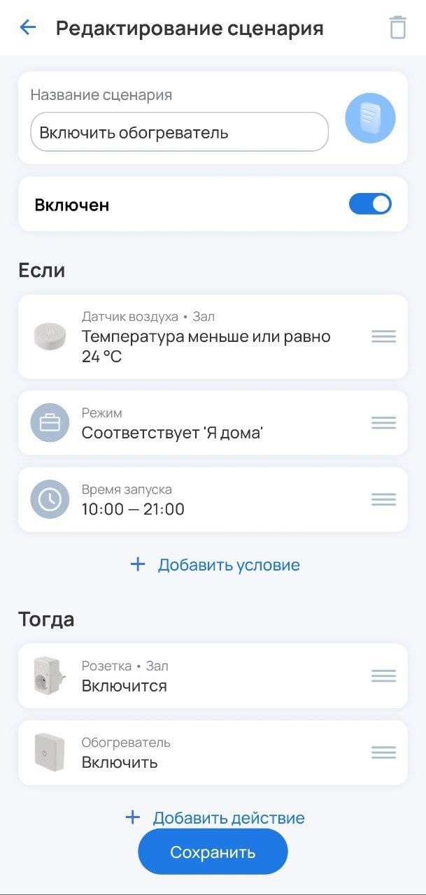 Введите название сценария, добавьте условия и действия. Нажмите Сохранить.