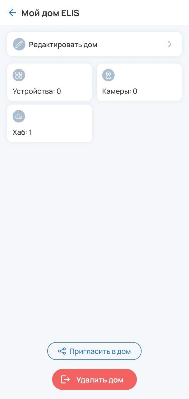 При открытии экрана редактирования в панели Дома есть возможность Пригласить в дом другого пользователя с облачной учётной записью и Удалить дом. Также можно изменить название дома.