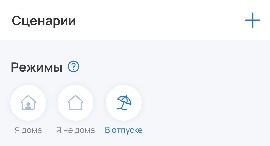 Режим дома задается пользователем путем нажатия на соответствующую иконку в сервисе Сценарии. При создании сценариев можно добавить в условие режим дома, тогда нужные действия будут выполняться при активации режима. При переключении режима можно запускать целую группу сценариев.