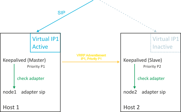 Такое функционирование системы обеспечивается организацией виртуального "расшаренного" между хостами интерфейса, который в каждый момент времени присутствует только на одном хосте. Этот функционал предоставляется службой keepalived и используется в протокольных адаптерах, которые непосредственно взаимодействуют с абонентами и шлюзами по VoIP-протоколам.