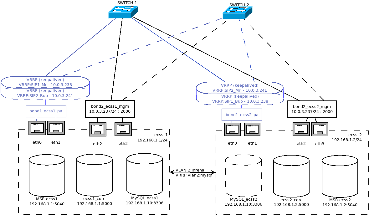ip a 3: bond1_ecss1_pa: <BROADCAST,MULTICAST,MASTER,UP,LOWER_UP> mtu 1500 qdisc noqueue state UP group default qlen 1000 link/ether ca:d2:8a:13:3a:11 brd ff:ff:ff:ff:ff:ff inet 10.0.3.238/24 scope global VRRP:SIP1_Mr 4: vlan2@bond1_ecss1_pa: <BROADCAST,MULTICAST,UP,LOWER_UP> mtu 1500 qdisc noqueue state UP group default qlen 1000 link/ether ca:d2:8a:13:3a:11 brd ff:ff:ff:ff:ff:ff inet 192.168.1.1/24 brd 192.168.1.255 scope global vlan2 inet 192.168.1.10/24 scope global secondary vlan2:mysql | ip a 3: bond1_ecss2_pa: <BROADCAST,MULTICAST,MASTER,UP,LOWER_UP> mtu 1500 qdisc noqueue state UP group default qlen 1000 link/ether a2:58:25:2b:22:28 brd ff:ff:ff:ff:ff:ff inet 10.0.3.241/24 scope global VRRP:SIP2_Mr inet 10.0.3.100/24 scope global secondary VRRP:TC_Bup 4: vlan2@bond1_ecss2_pa: <BROADCAST,MULTICAST,UP,LOWER_UP> mtu 1500 qdisc noqueue state UP group default qlen 1000 link/ether a2:58:25:2b:22:28 brd ff:ff:ff:ff:ff:ff inet 192.168.1.2/24 brd 192.168.1.255 scope global vlan2 |