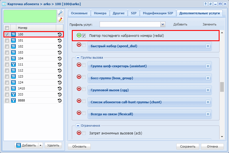 - Разрешите использовать услугу абоненту - установите . Установите флаг напротив услуги "Повтор последнего набранного номера (redial)".