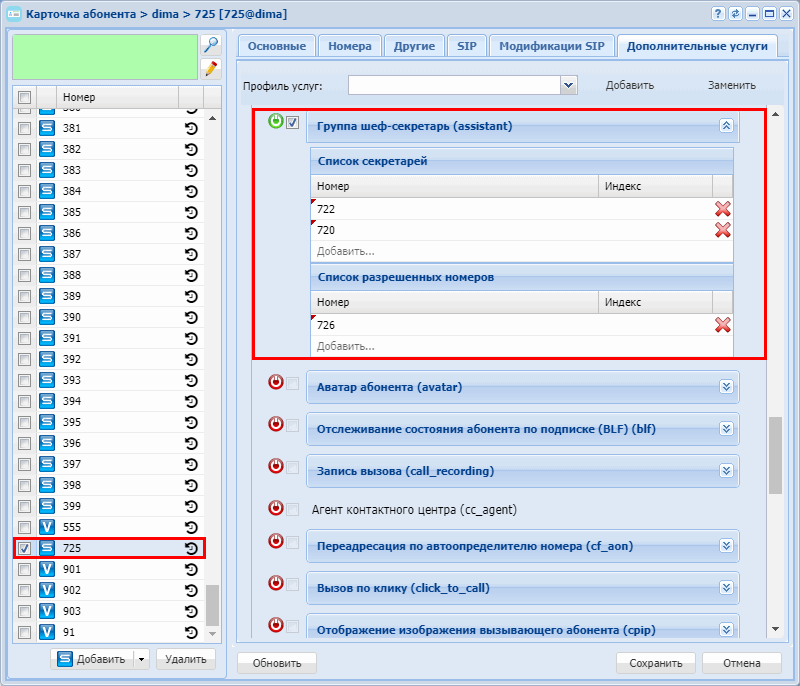 Настроим услугу assistant на номере 725 (шеф). Дополнительно используются следующие номера: