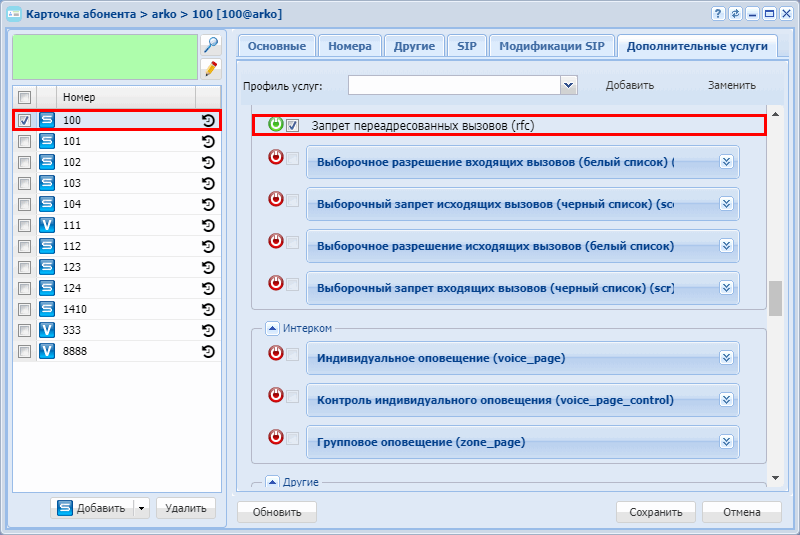 Для абонента с номером 100 настраиваем услугу по примеру настройки.