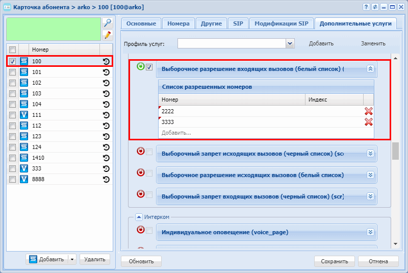 - Разрешите использовать услугу абоненту - установите . Установите флаг напротив услуги "Выборочное разрешение входящих вызовов (белый список) (sca)".