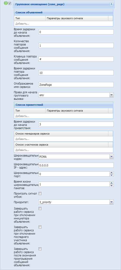 - Для активации услуги установите флаг напротив значения "Групповое оповещение (zone_page)".