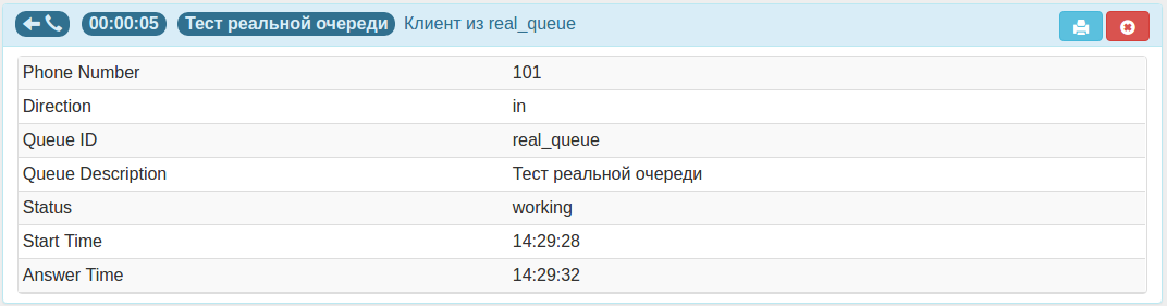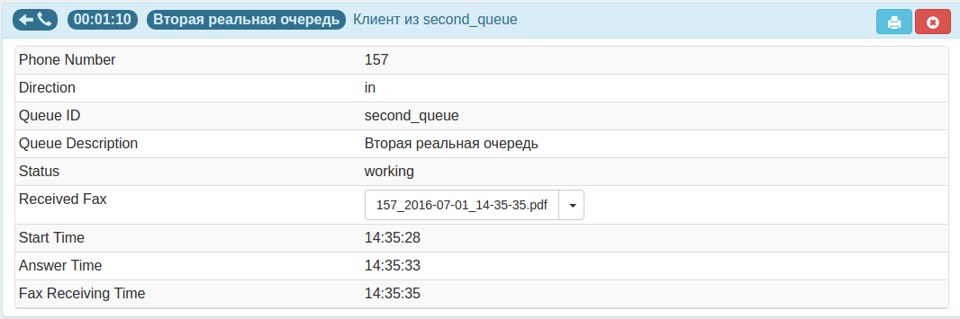 Для того чтобы принять факс, необходимо нажать на кнопку "Принять факс", при этом клиенту подключится подсистема приема факса, а карточка примет следующий вид:
