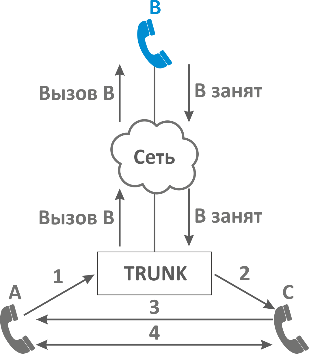 2. Если абонент B занят, то происходит переадресация вызова на абонента С.