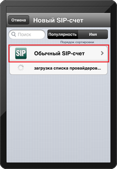 Для добавления учетной записи в главном окне нажмите кнопку «Настройки», зайдите в меню «SIP-счета». На следующем экране нажмите кнопку «+» для создания новой учетной записи. Выберите тип создаваемой учетной записи — «Обычный SIP-счет».
