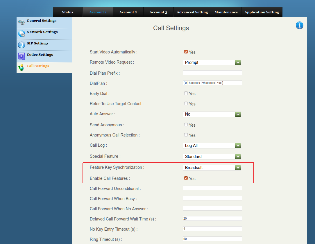"Account" -> "Call Settings" -> "Feature Key Synchronization :" -> Broadsoft
