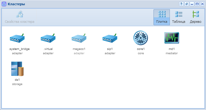 | Кнопки для управления видом рабочей области: плитка (tiles),таблица (grid),дерево (tree) | Плитка (tiles). Список кластеров представляется в виде иконок с именем кластера и его ролью (рисунок 1). | |