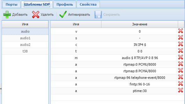 - SDP templates (Шаблоны SDP) – управление SDP шаблонами: