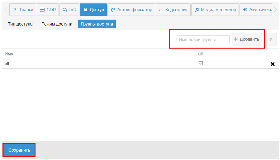 Группа будет добавлена в список групп доступа виртуальной АТС.