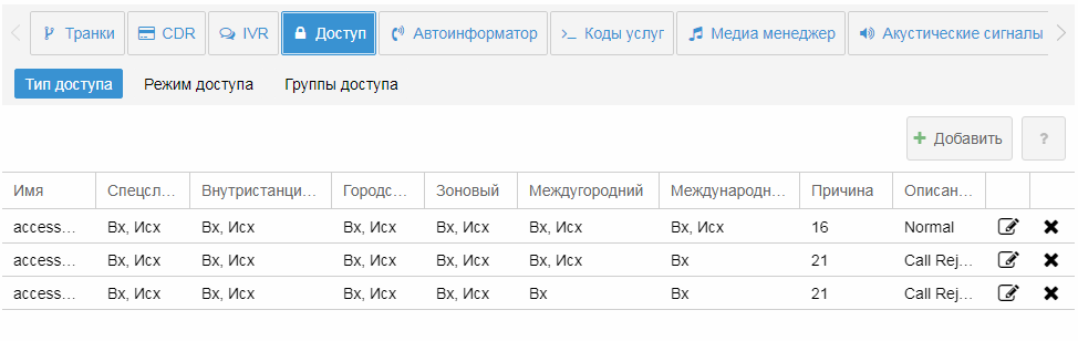 В разделе "Настройки" ("Settings"), во вкладке "Доступ" ("Access") в рамках виртуальной АТС выполняется настройка групп доступа, режимов доступа и типов доступа.
