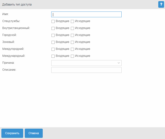 Для добавления типа доступа нажмите кнопку "Добавить" ("Add") и выполните следующие настройки: