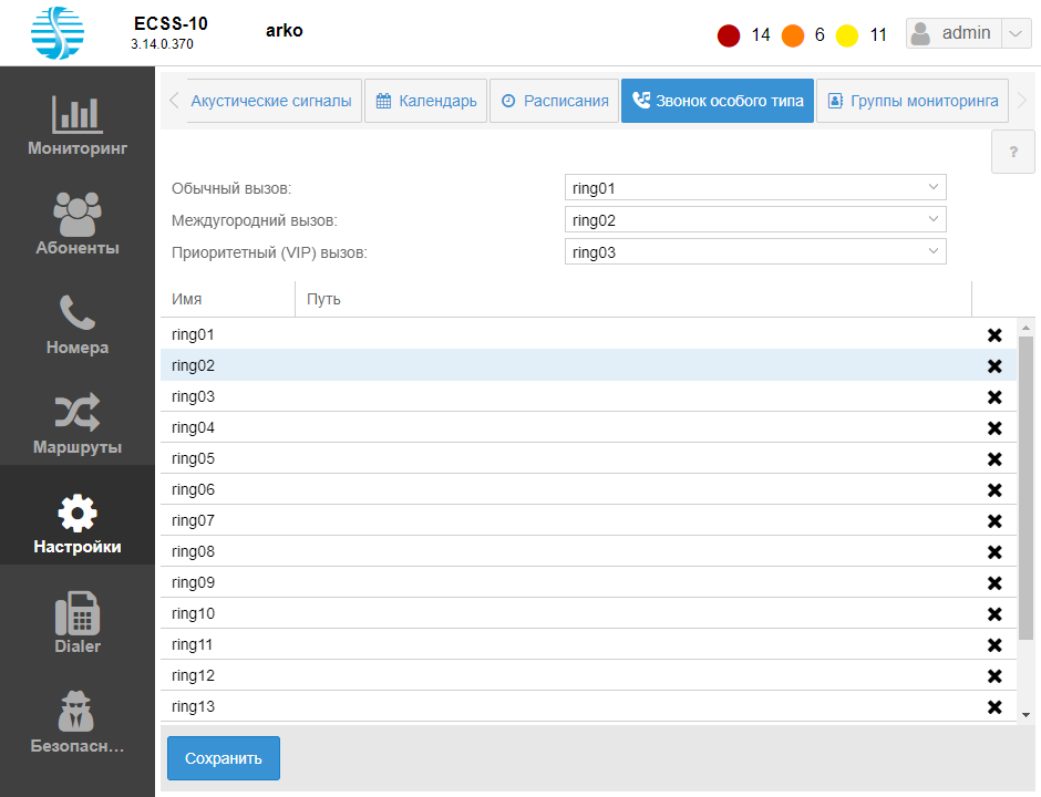 В разделе «Настройки» («Settings») во вкладке «Звонок особого типа» («Distinctive ring») в рамках виртуальной АТС выполняется настройка рингтонов для звонков особой категории.