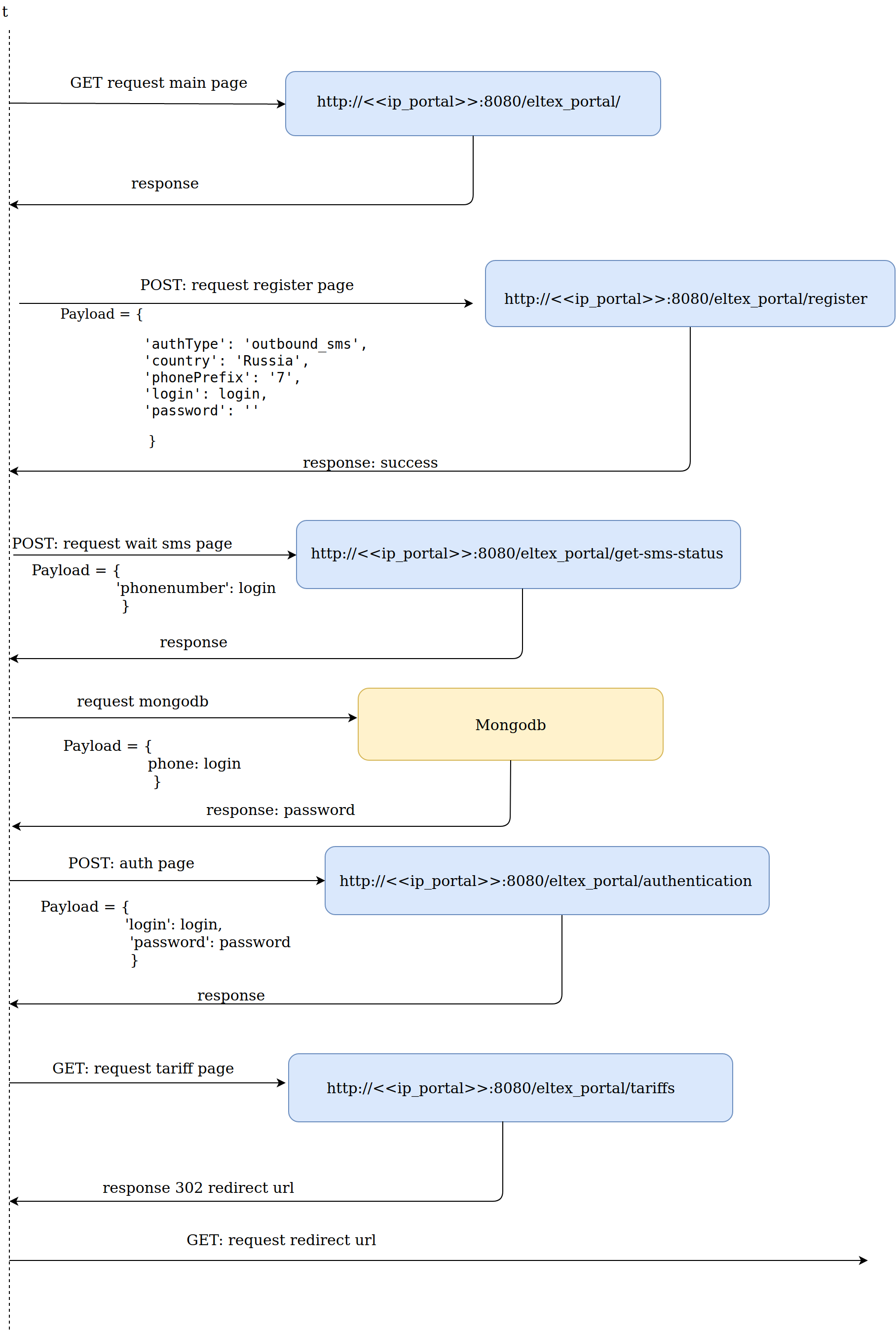 выполняется запрос в базу данных монго для получения пароля. Далее данные (логин и пароль) передаются порталу на проверку связки логин-пароль, после успешной проверки происходит назначение тарифа тестовому пользователю и редирект на внешний адрес.