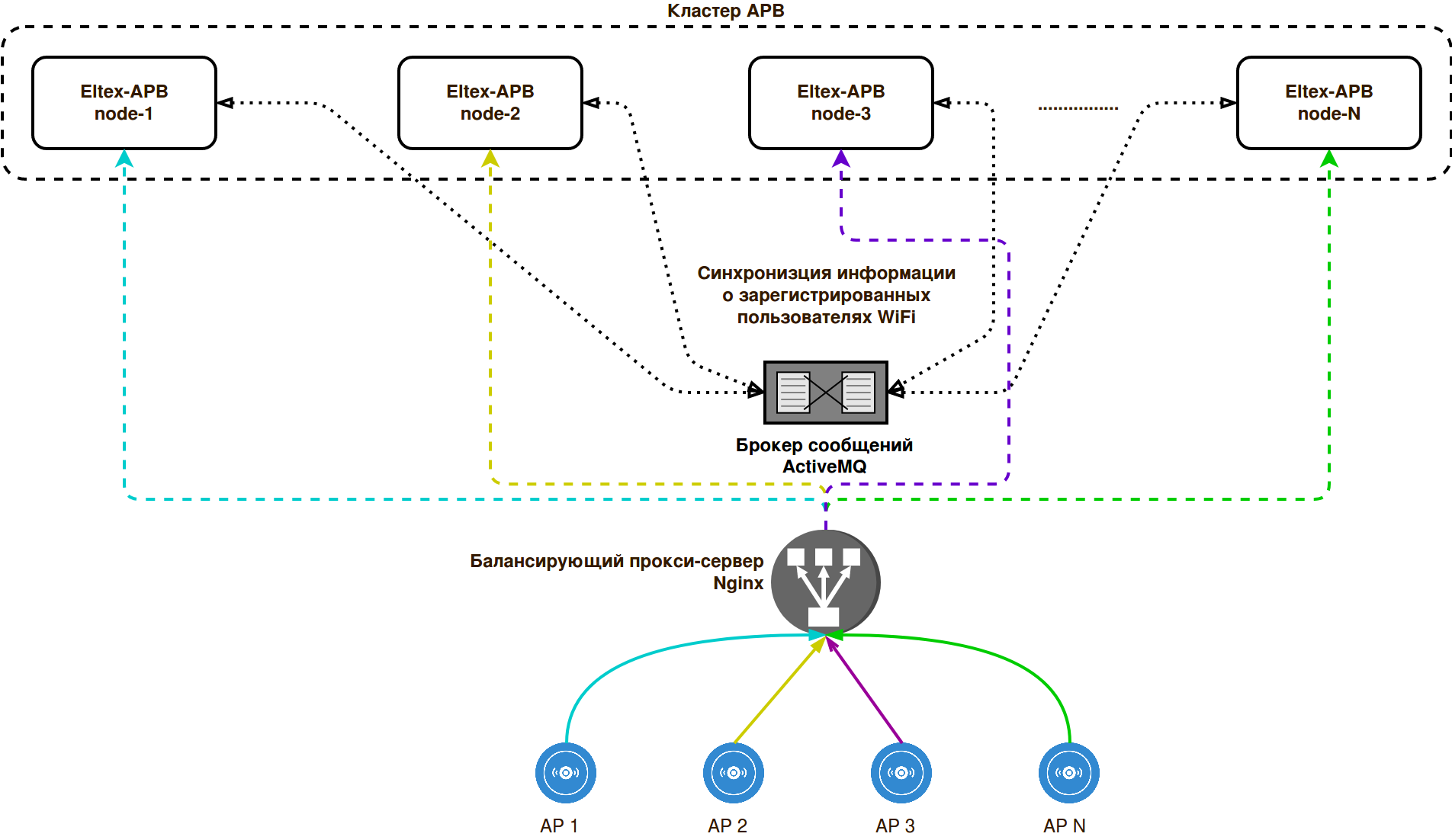 Масштабирование сервиса Eltex-APB предполагает создание кластера из серверов APB и балансировку нагрузки на разные ноды кластера. Для балансировки нагрузки используется проксирующий веб-сервер NGINX (может быть использован другой тип сервера). На нодах APB для синхронизации информации о пользователях-WiFi используется EHCACHE (универсальная система распределенного кэширования общего назначения). Для гарантированной доставки информации по синхронизации между нодами используется брокер сообщений ActiveMQ. Общая схема приведена ниже, на рис. 1.