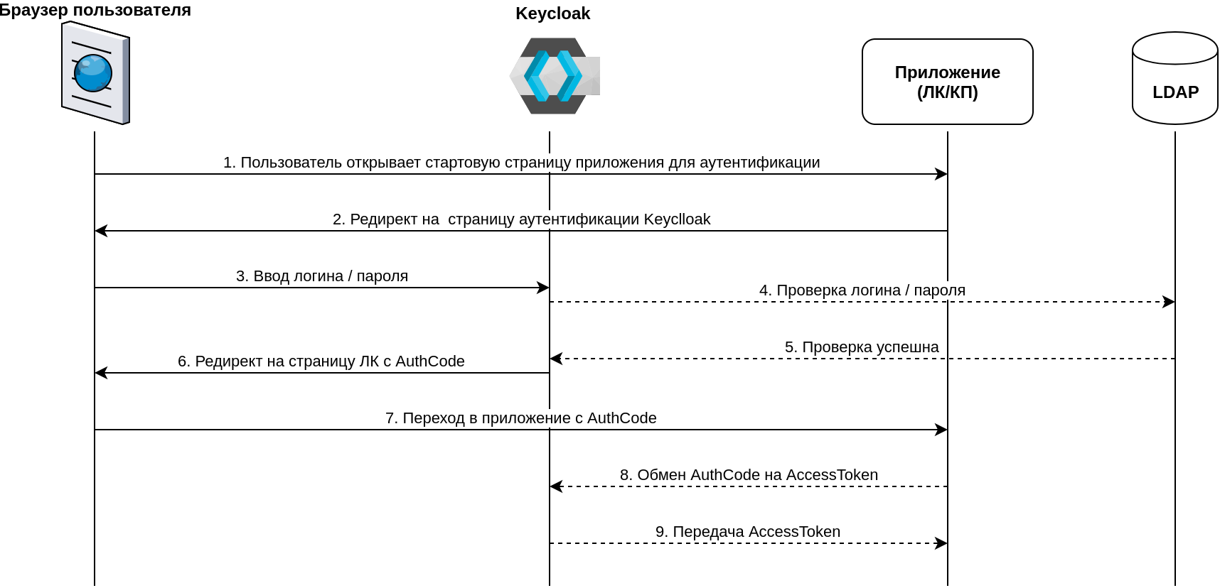 | В некоторых браузерах при возникновении ошибок в настройке взаимодействия приложений с Keycloak может наблюдаться "белый экран", когда никакой ошибки в браузере не отображается. В этом случае следует смотреть логи соответствующего приложения. |