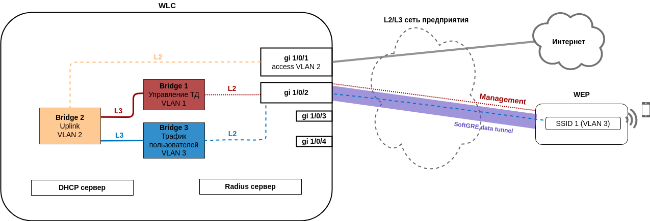 Выделение и настройка VLAN при подключении новых точек доступа может оказаться трудоемкой задачей, особенно если на сети предприятия между точками доступа и контроллером используется большое количество коммутаторов. Поэтому заводская конфигурация WLC предполагает построение SoftGRE DATA туннелей для передачи пользовательского трафика. Такое решение даже в L2-сети позволяет упростить подключение точек доступа, так как отсутствует необходимость прокидывать VLAN для каждого SSID через все коммутаторы.