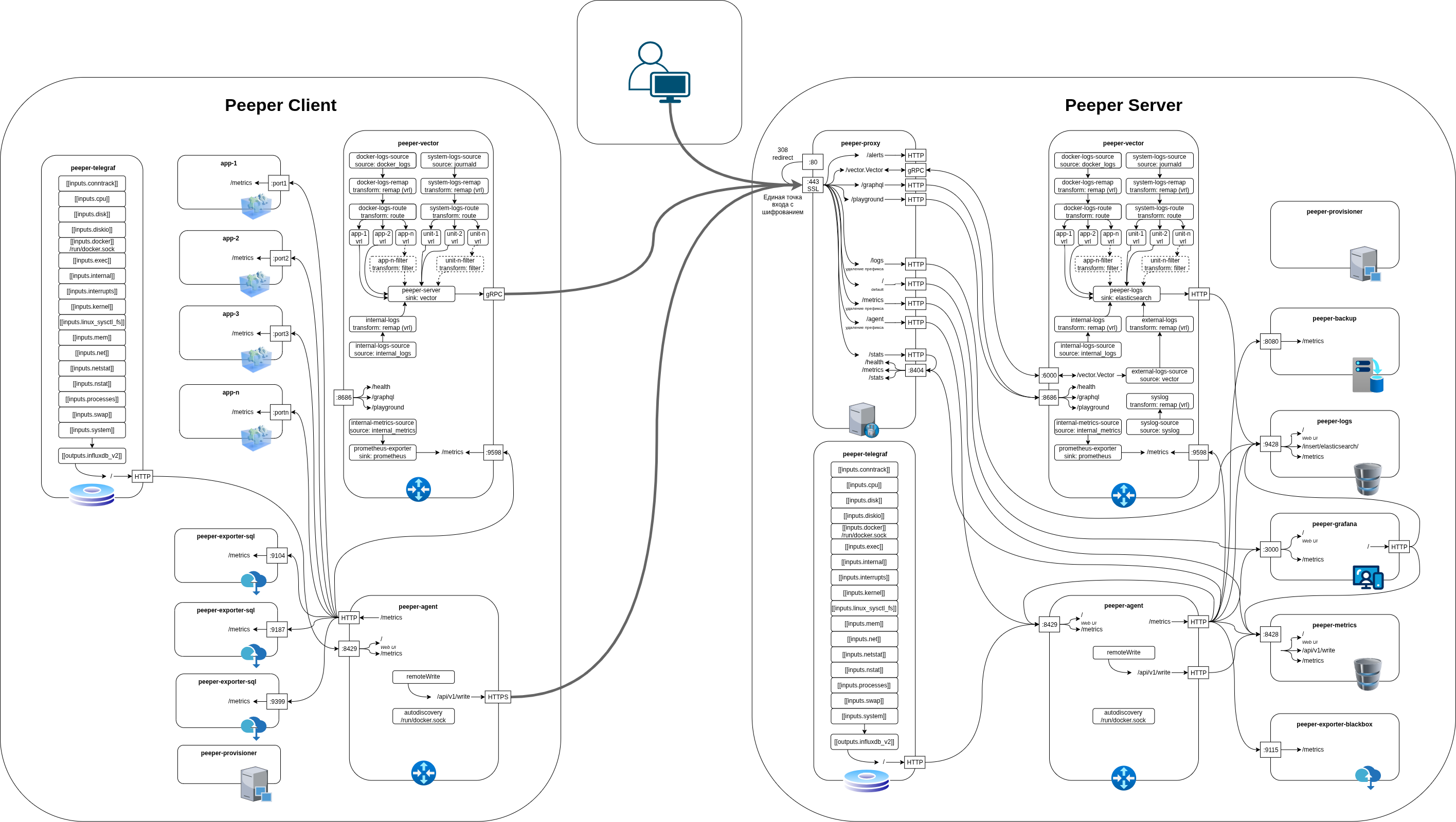 В архитектуре Peeper предусмотрено, что для получения метрик со стороны Peeper Client не требуется открывать никаких дополнительных портов на стороне сервера с программным продуктом Eltex. Отправка метрик с этого сервера производится методом Push.