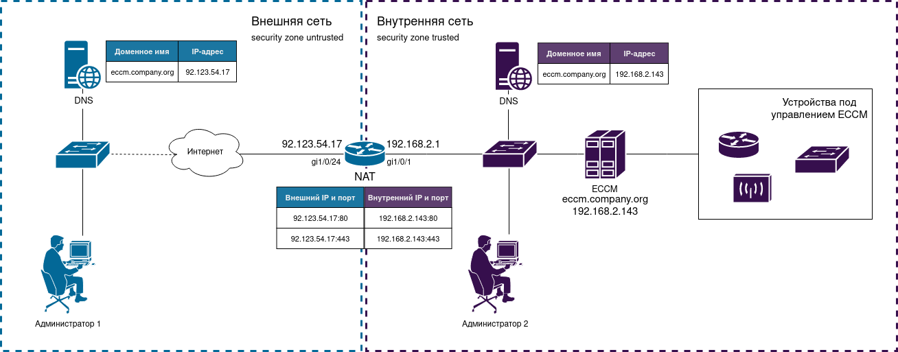 Для того чтобы у Администратора 1 и Администратора 2 был равный доступ до сервера ECCM, находящегося во внутренней сети предприятия («за NAT»), необходимо, чтобы в адресной строке браузера Администраторы обращались по одному и тому же адресу. Решение поставленной задачи может быть достигнуто при соблюдении условий: