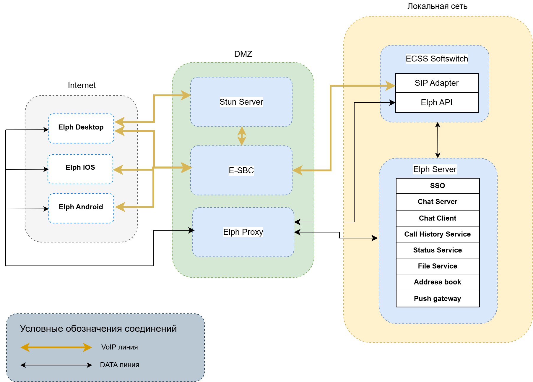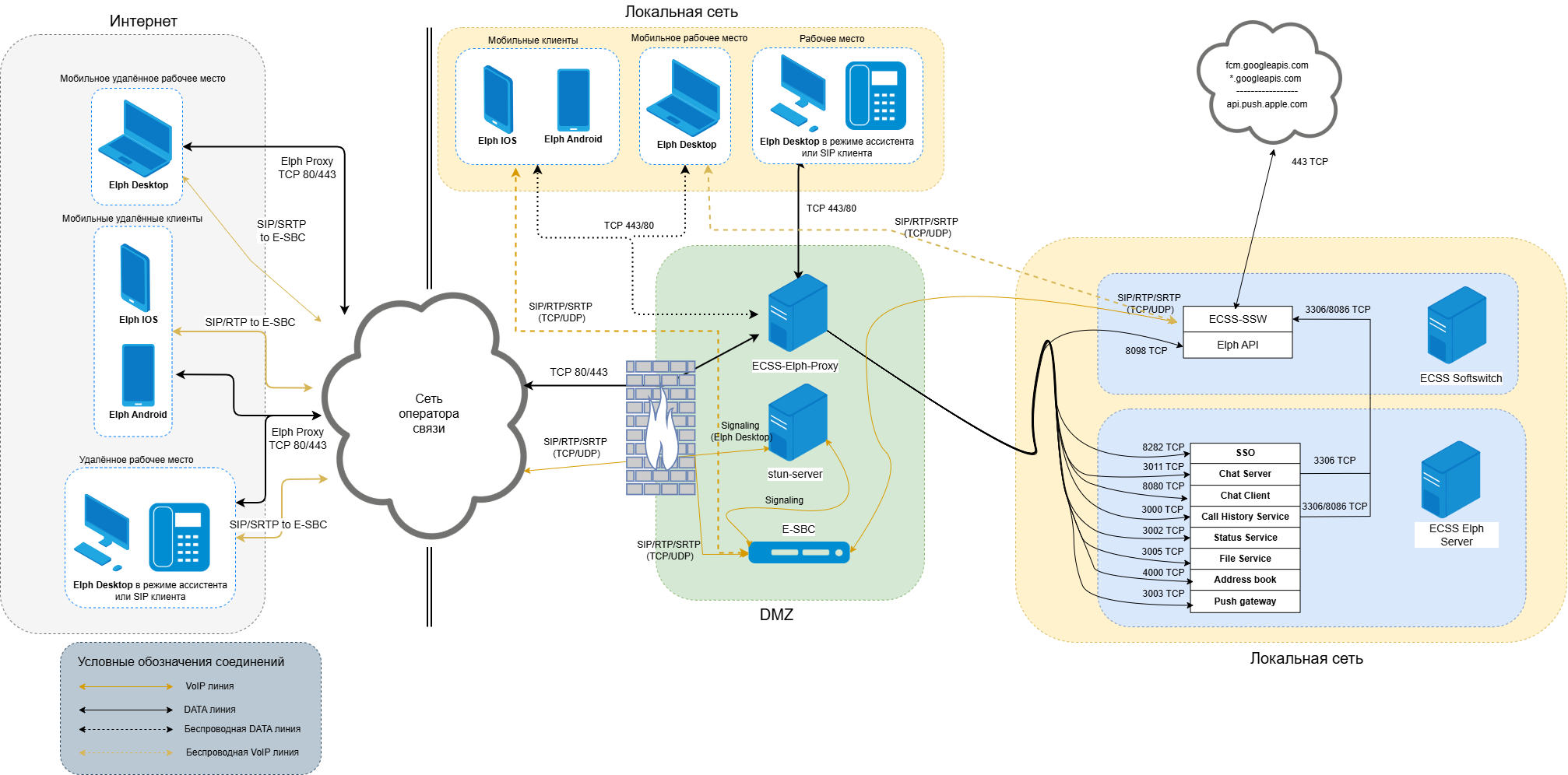 | Elph Desktop/Android/IOS | E-SBC | UDP/5060 (SIP), UDP/RTP 10000-20000 | SIP-сигнализация и медиапотоки (через E-SBC) |