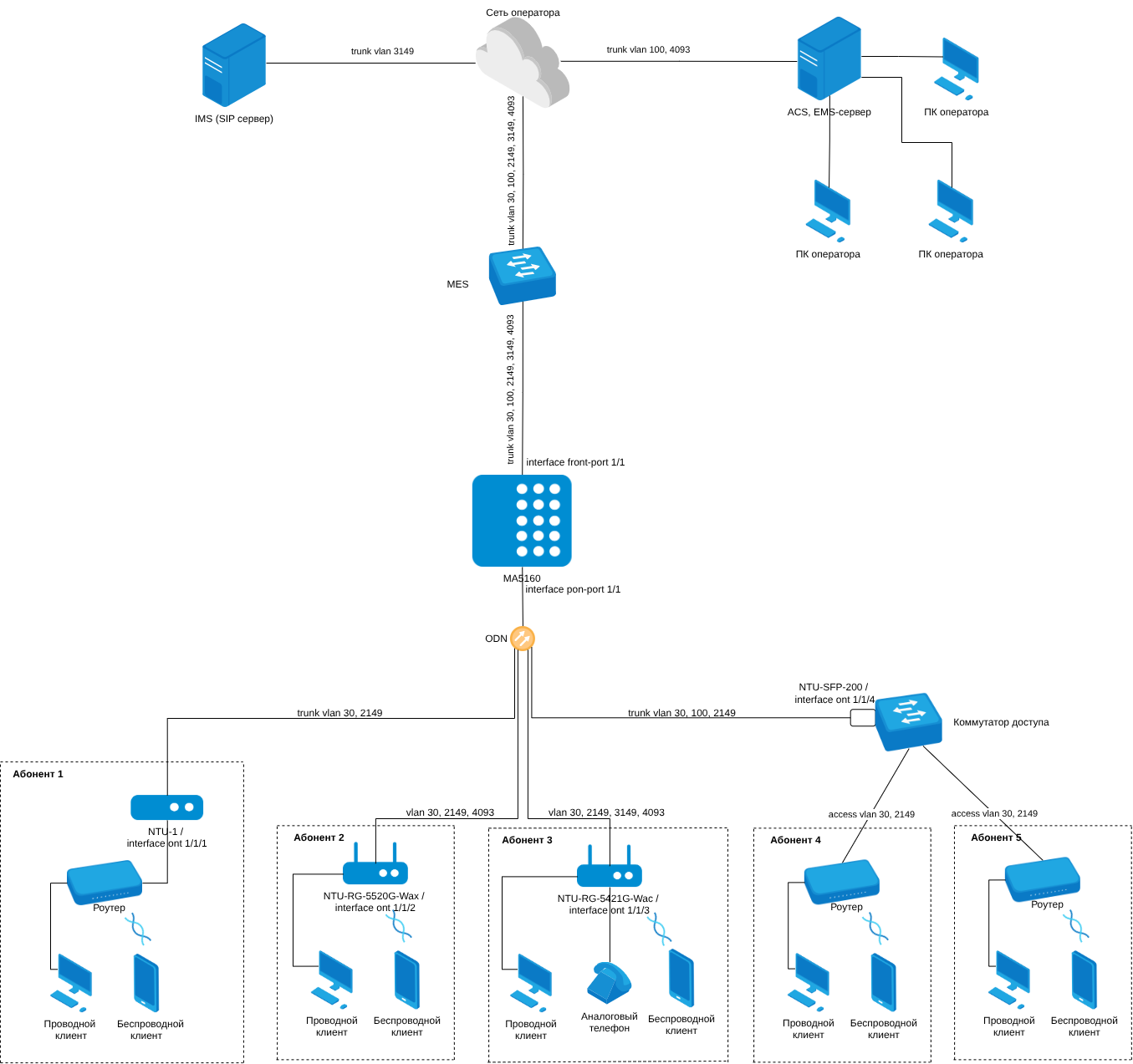Рассмотрим схему включения, аналогичную рассматриваемой в разделе «Конфигурация оборудования и проверка работоспособности (схема GPON)», с небольшими отличиями. В качестве линейной платы по схеме предусмотрено использование LC16G. Исходные данные для данной схемы: