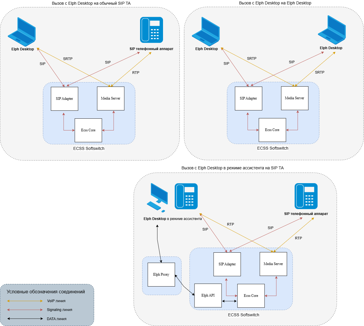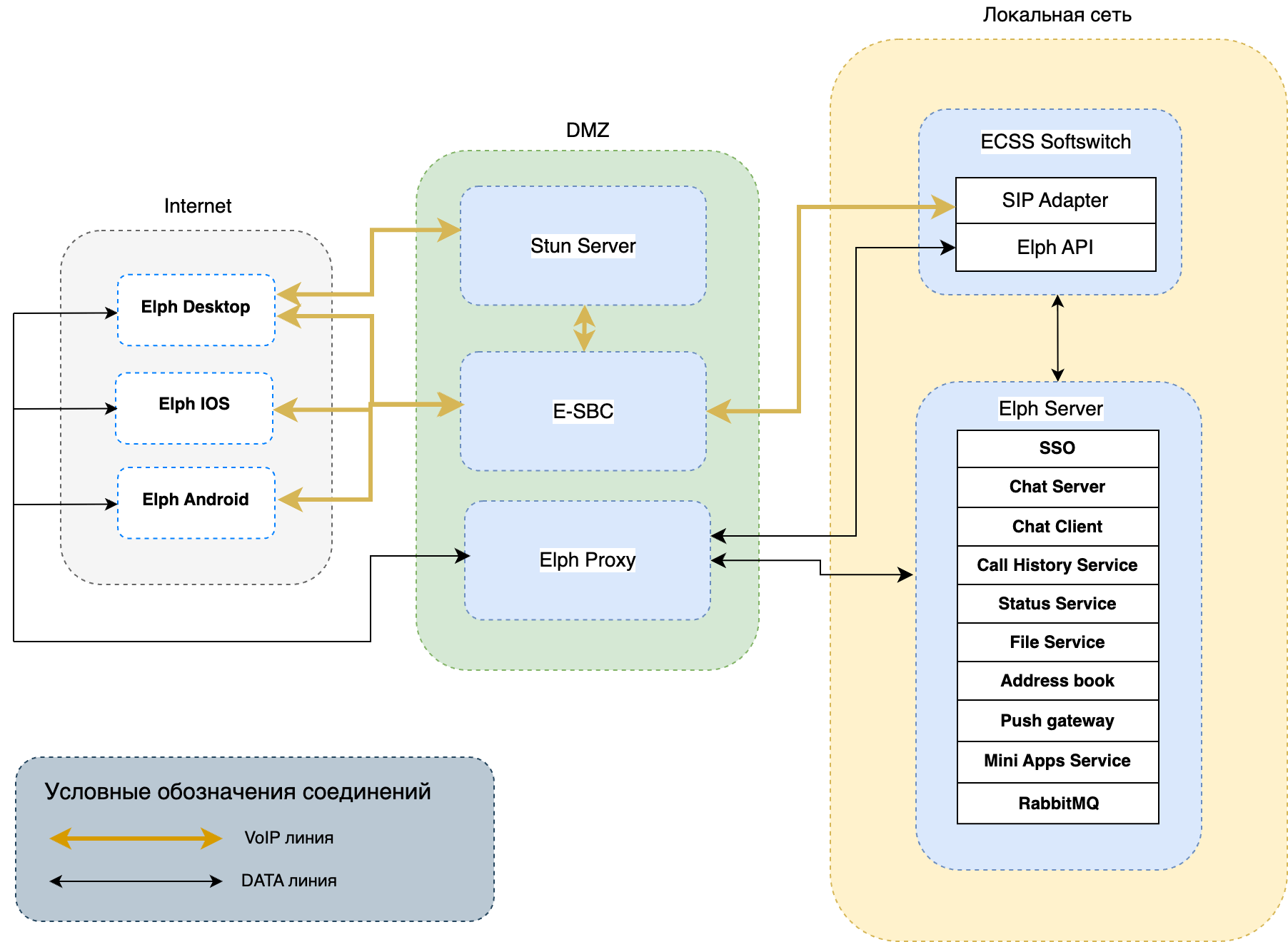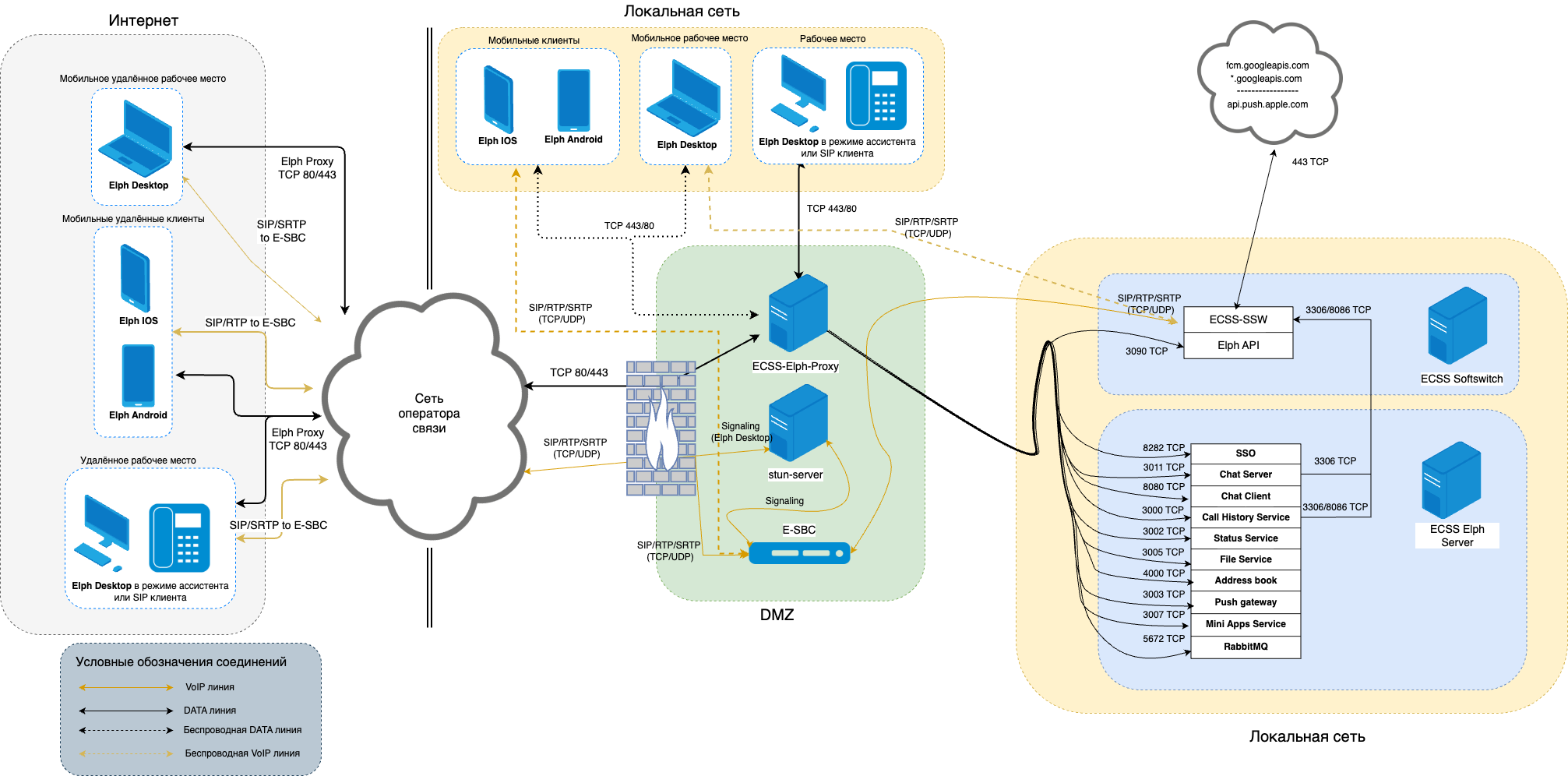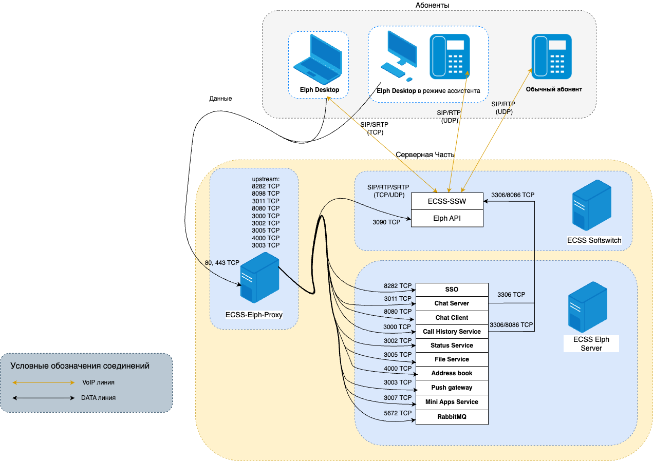| Elph Desktop/Android/IOS | E-SBC | UDP/5060 (SIP), UDP/RTP 10000-20000 | SIP-сигнализация и медиапотоки (через E-SBC) |