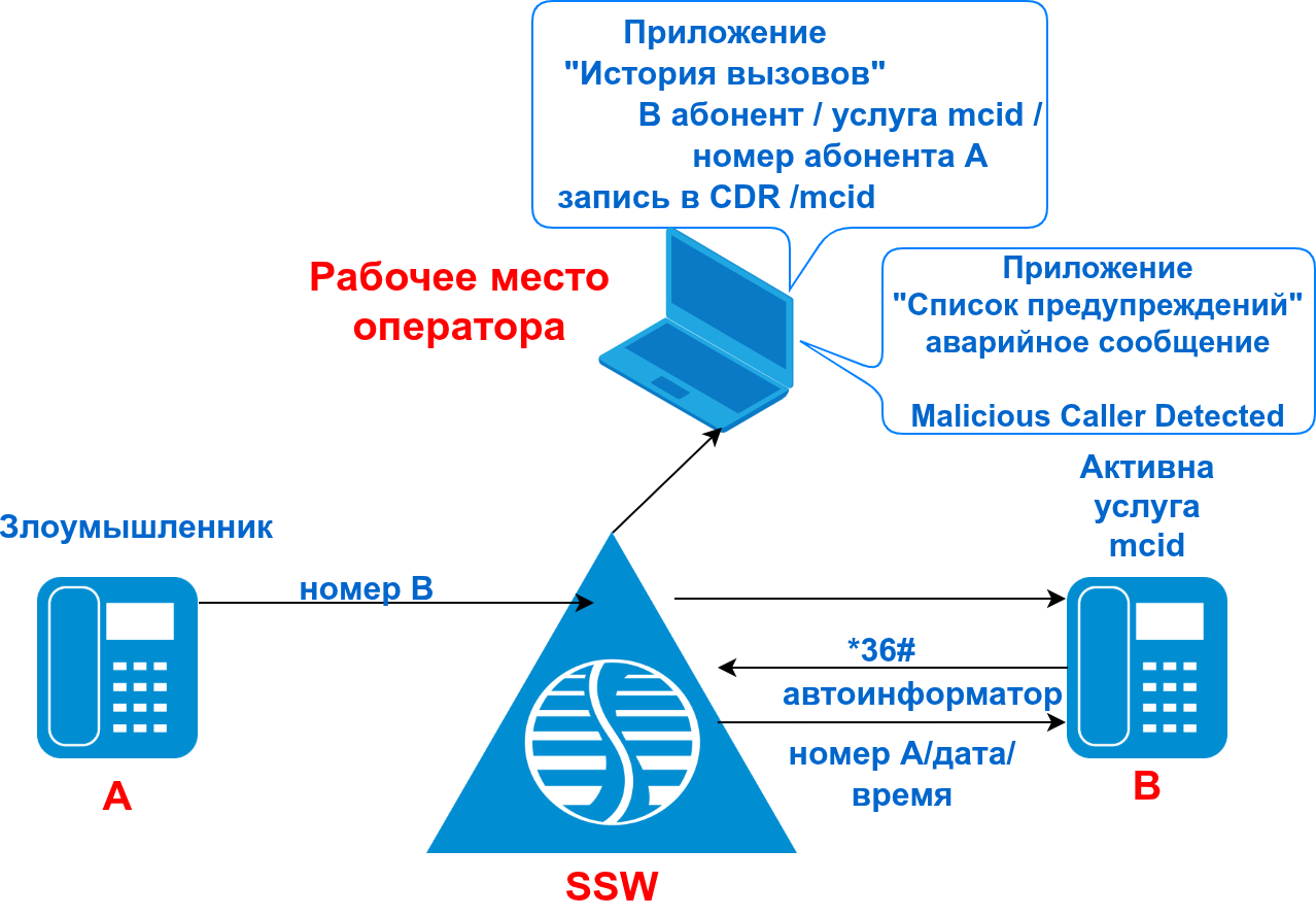 Абонент, после разговора со злоумышленником, набирает код услуги (*36#), автоинформатор сообщает абоненту последний номер, с которого поступил вызов, дату и время звонка. SSW помечает данный вызов как злонамеренный. Это отражается в записях о вызове, в записях CDR. Так же создается аварийное сообщение тип mcid c указанием злонамеренного номера. Оператор может просмотреть в записях о вызовах (приложение "История вызовов") информацию о звонках с пометкой mcid — вызов злонамеренный. Также появится CDR запись типа Service для ДВО MCID. При этом номер А — это "злонамеренный номер". Также, если после злонамеренного вызова прошло уже много времени, пользователь может отправить оператору запрос и получить от него информацию по данному вызову (по данным в CDR). Эта услуга позволяет абоненту прослушать следующие данные: - время и дату поступления вызова;