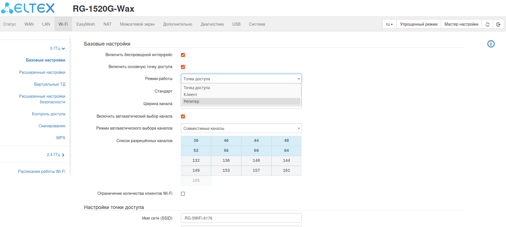 Иногда возникает необходимость расширить существующую Wi-Fi сеть. Один из способов это сделать - подключить RG-1520G-Wax/Wax-Z в режиме репитера. Ниже приведен пример настройки для подключения к сети 5 GHz. Конфигурация выполняется в web-интерфейсе роутера в расширенном режиме.