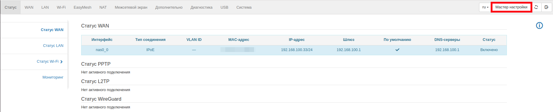 Для запуска мастера настроек на ранее сконфигурированном устройстве необходимо нажать кнопку "Мастер настройки", расположенную в верхнем правом углу экрана.