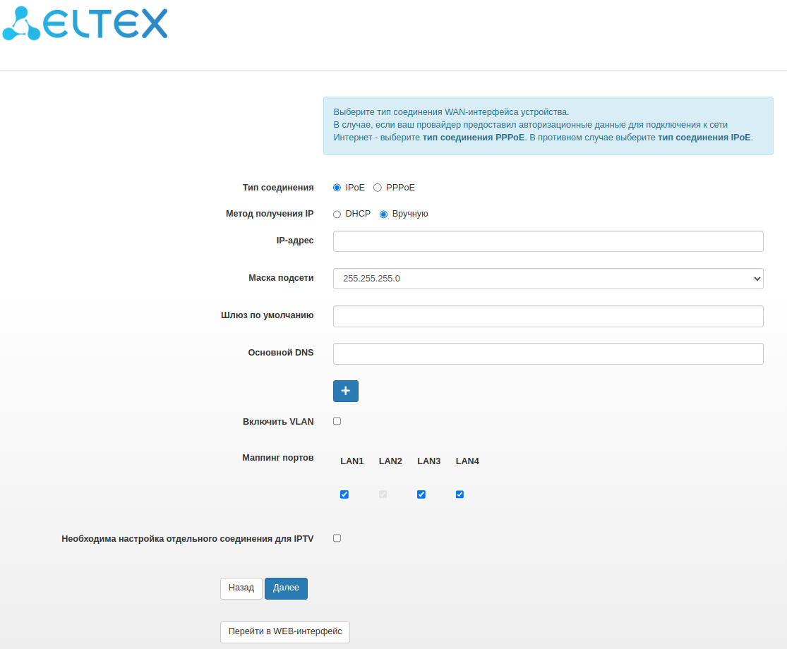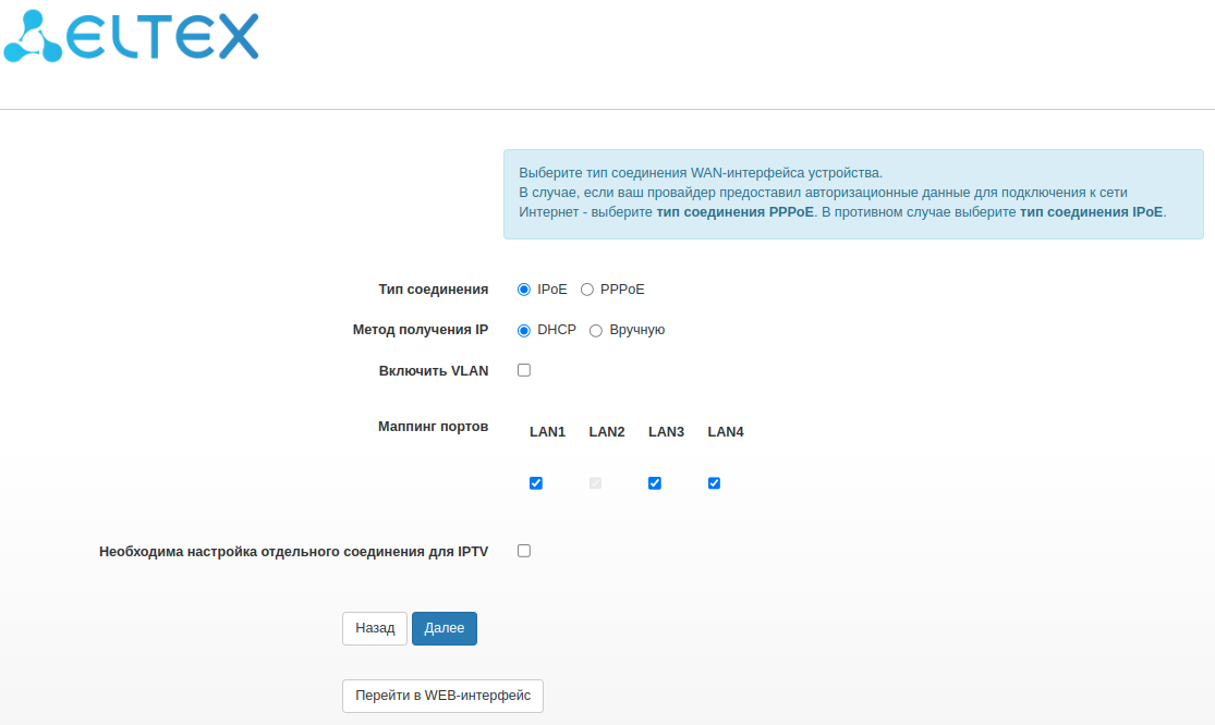 При первом включении маршрутизатора Eltex и подключении сетевого кабеля в WAN-порт требуется указать тип подключения, используемый провайдером.